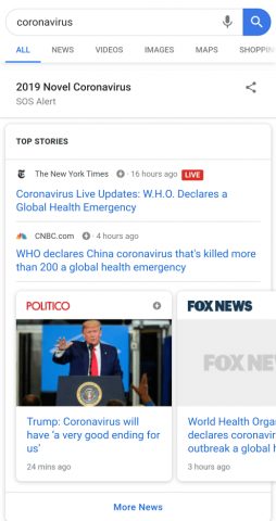 З огляду на популярність пошуку від Google, компанія використовує його для поширення інформації про надзвичайні ситуації. Так, Google запустила сервіс SOS Alert з питань коронавіруса. Це дозволить максимально швидко інформувати користувачів про актуальну ситуацію з епідемією небезпечного захворювання.