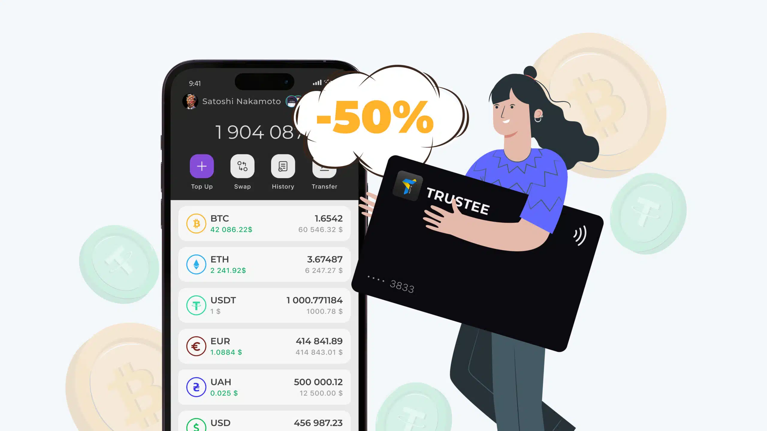 Річниця продукту Trustee Plus підводить нас до унікальної акції з 50% знижкою на оформлення платіжної картки. Мабуть, це найкраща можливість для користувачів приєднатися до прогресивного суспільства криптовалют і отримати у свої руки гнучкий набір інструментів для роботи з цифровими активами.