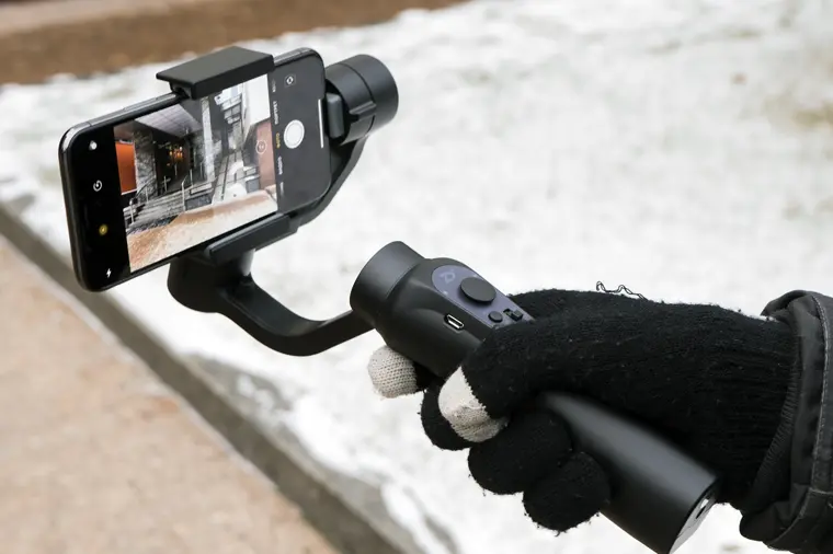 Имеет очень простую конструкцию из шарнирной подвижной рамы, которая двигается с помощью электромоторов и крепится к специальной ручке. Для использования достаточно вставить смартфон в рамку стедикама и зафиксировать его в горизонтальном положении, которое без проблем меняется датчиками.