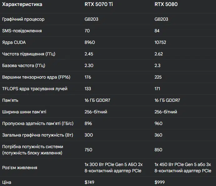 В основу GeForce RTX 5070 Ti ляже той самий GPU, що встановлений у GeForce RTX 5080. Йдеться про урізаний GB203. З характеристиками чіпа можна ознайомитися нижче: