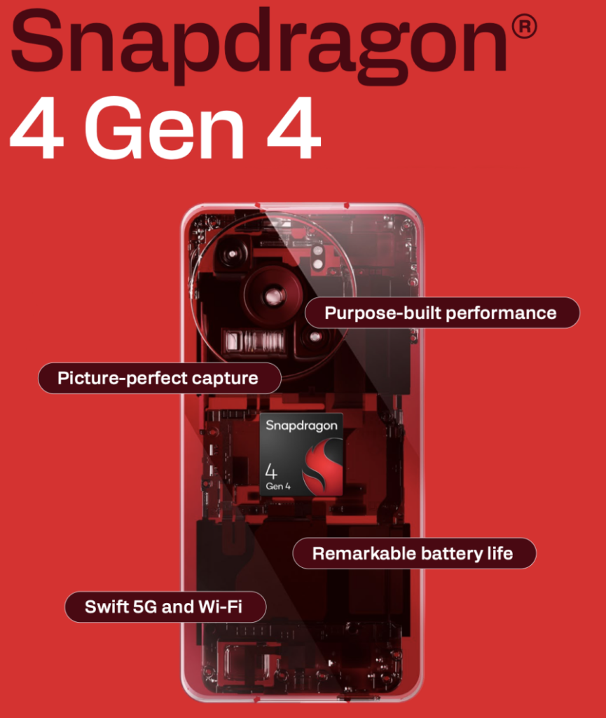 Snapdragon 4 Gen 4 отримав 5G-модем з підтримкою SA і NSA, видаючи швидкість завантаження до 2,5 Гбіт/с. Процесор виконаний за більш сучасним 4-нм техпроцесом і використовує конфігурацію з двох продуктивних ядер з частотою до 2,3 ГГц і шести енергоефективних до 2,0 ГГц. Графіка Adreno підтримує екрани з роздільною здатністю Full HD+ і з частотою 120 Гц, а серед ключових відмінностей — сумісність з LPDDR5 і накопичувачами UFS 3.1, а також більш швидка зарядка Quick Charge 4+.