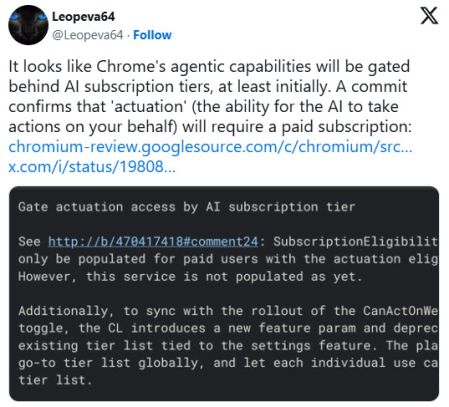 У тестовій версії рушія Chromium, який є основою для Chrome та багатьох інших сучасних браузерів, виявили згадки про нову модель розповсюдження функцій. Згідно зі знайденими даними, Google розглядає можливість впровадження розширених інструментів штучного інтелекту, доступ до яких надаватиметься виключно за умови оформлення платної підписки.
