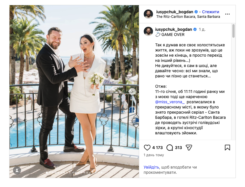 Український актор і телеведучий Богдан Юсипчук, відомий своїми титулами «Містер Україна-2014» та «Mister Sea World-2018», змінив сімейний статус. 37-річний артист повідомив, що офіційно одружився зі своєю коханою Веронікою, з якою перебував у стосунках понад чотири роки. Церемонія розпису відбулася ще 11 січня у місті Санта-Барбара (США), відомому завдяки однойменному культовому серіалу.
