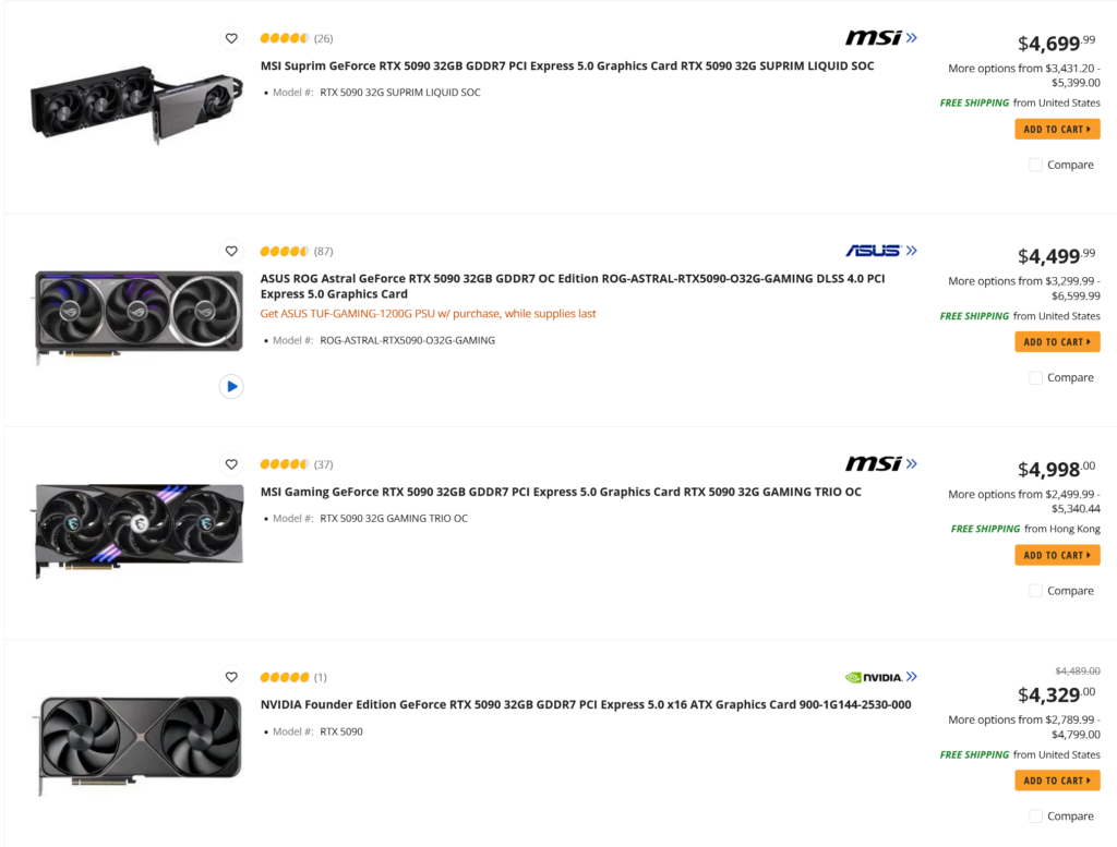 Ціновий шок: Ситуація виглядає критичною. GeForce RTX 5080 на майданчиках на кшталт Newegg продається з націнкою в $500 і більше від рекомендованої ціни ($1000). Топова RTX 5090 взагалі досягає позначки в $5000 при офіційній вартості $2000. Постраждав і середній сегмент: наприклад, RTX 5060 Ti з 16 ГБ пам’яті тепер коштує близько $1500 — удвічі дорожче за рекомендовану ціну.