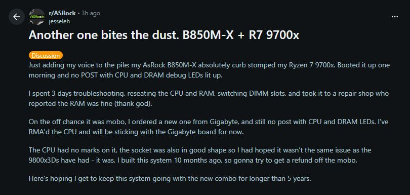 Користувачі форуму Reddit масово скаржаться на критичні збої в роботі комп’ютерів, побудованих на базі платформи AM5 від ASRock. Лише за останню добу з’явилося п’ять повідомлень про вихід з ладу процесорів лінійки Ryzen 9000. Проблема зачіпає як бюджетні, так і топові конфігурації.