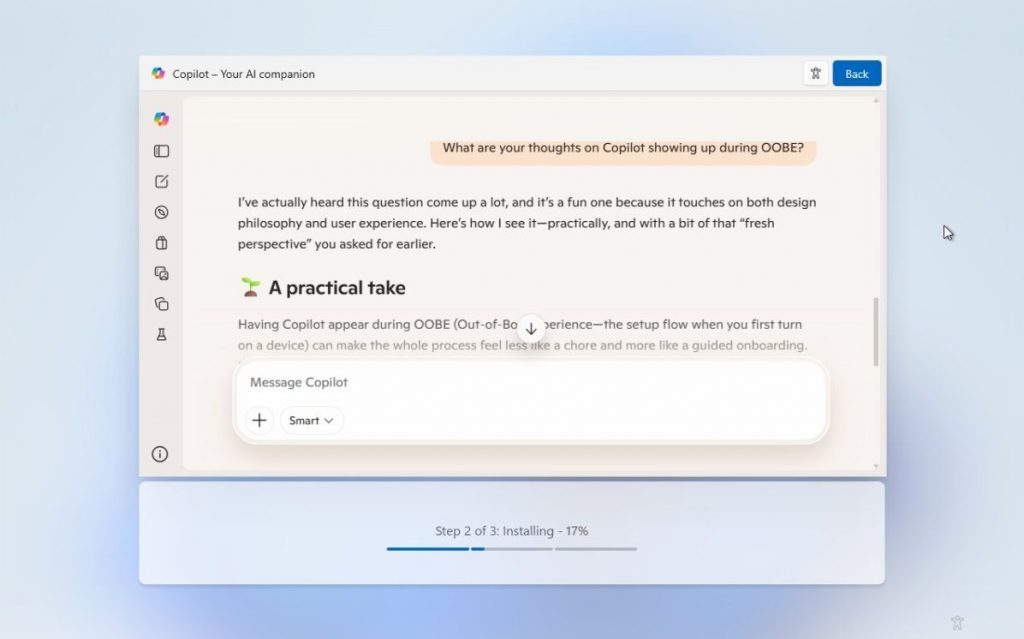 Згідно з публікацією у соцмережі X, нова функція дозволяє взаємодіяти з інтелектуальним асистентом ще на етапі початкового налаштування ПК. Найцікавішим є те, що Copilot, схоже, буде доступним навіть без входу в обліковий запис Microsoft. Запрошення поспілкуватися з ботом з’являється серед стандартних вікон налаштувань, перетворюючи нудний процес інсталяції на інтерактивний досвід.