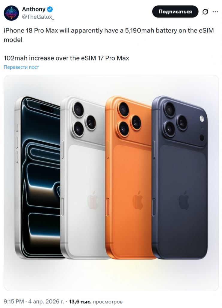 Таким чином, ємність батареї iPhone 18 Pro Max буде на 102 мАг більшою, ніж у його попередника — iPhone 17 Pro Max (також у версії з eSIM).