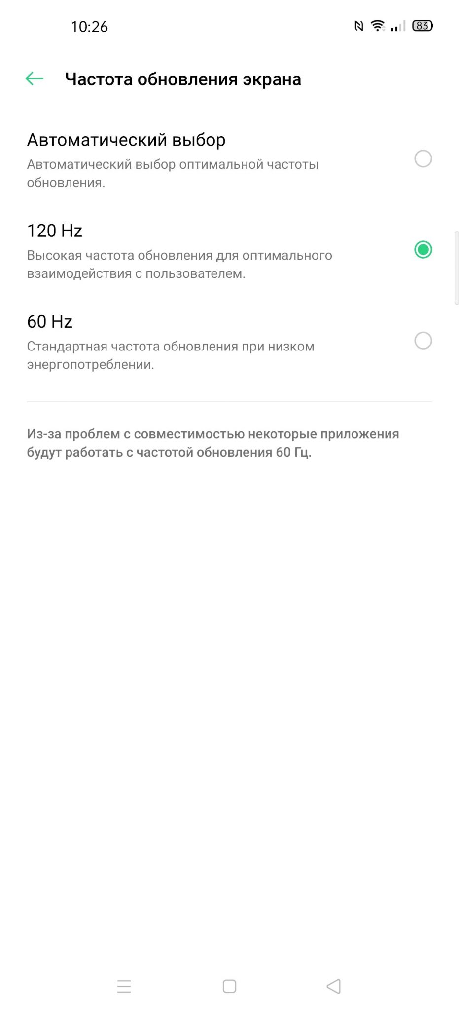 В налаштуваннях передбачений автоматичний режим, коли процесор сам підвищує частоту дисплея в залежності від активного на ньому контенту. Для економії заряду батареї рекомендується встановити стандартну частоту 60 Гц.