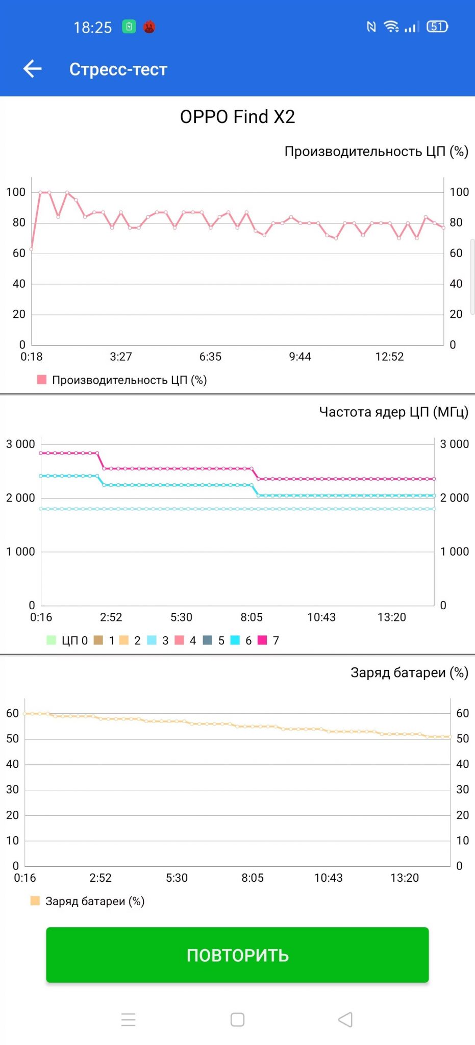 Що стосується процесу зарядки, то з початком використання комплектного «товстого» кабелю та адаптера живлення потужністю 65 Ватт, розміри якого приблизно вдвічі більше звичайного, подвійний акумулятор смартфона наповнюється енергією з 5 до 100% всього за 36 хвилин. Виробник заявляє, що технологія швидкої зарядки Super VOOC здатна закачати в батарею 90% енергії за 30 хвилин. Як показав практичний тест, з 5 до 90% смартфон зарядився за 26 хвилин, що вражає.