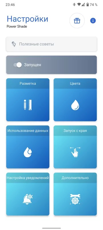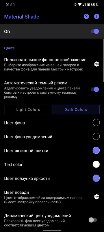 Як і в Power Shade, тут присутні величезні можливості по частині кастомізації: можна налаштувати плитки, повзунки, кольори, стилі значків, розмітку, повідомлення, включити рядок стану знизу, а також задати параметри для індикатора. На жаль, включити повідомлення можна тільки після придбання повної версії програми, що є досить неприємним мінусом.