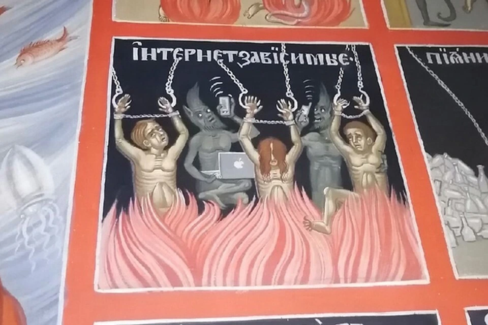 Один з жителів села Ніколо-Малиця, що Тверській області, зауважив, що на стіні місцевого храму зображені чорти зі смартфонами в руках і ноутбуком на колінах. Причому на фресці можна розглянути фірмовий логотип Apple, розташований на ноутбуці.