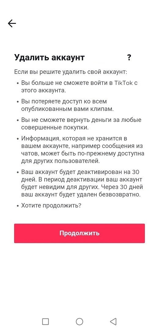 - Вас перекине в нове меню. Натисніть на рядок «Видалити акаунт». ТікТок відобразить умови видалення і попросить підтвердити своє рішення за допомогою кнопки «Продовжити». Якщо ви впевнені у своєму рішенні, сміливо натискайте на неї.