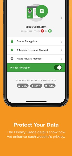 Світова павутина набита безліччю трекерів, які так чи інакше можуть збирати про вас різну інформацію. При переході на будь-який сайт DuckDuckGo аналізує з’єднання і виносить власну оцінку (від A до E). Чим гірше оцінка, тим менш безпечним є ресурс (містить більше інструментів і скриптів, що займаються відстеженням). Під час аналізу програма навіть виведе назви трекерів, які намагаються вести стеження.