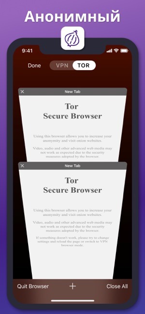 Ще один браузер в даній підкатегорії – VPN + TOR Browser. Доступ в мережу тут проходить шифрування і тунелювання через Tor. А з огляду на наявність вбудованого проксі-сервера, запити, що відправляються вами будуть виходити зовсім з іншого місця. Це означає, що реальна IP-адреса буде постійно прихована, тому якщо деякі трекери і зможуть отримувати якусь інформацію, то вона буде фіктивною.
