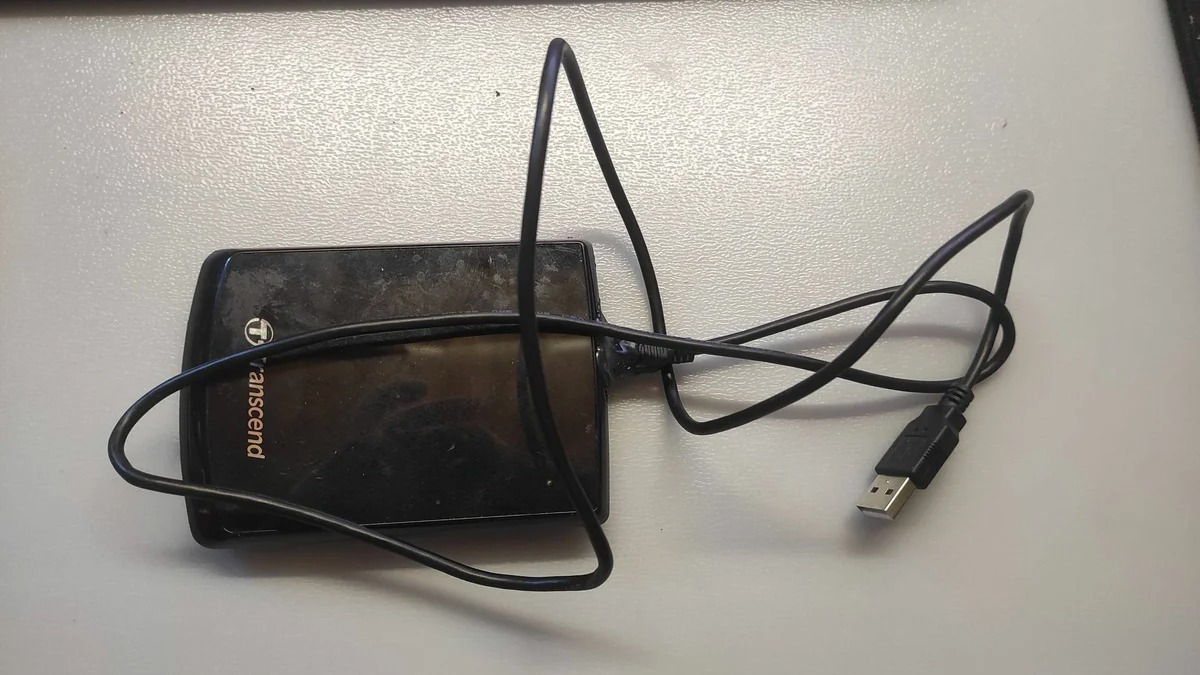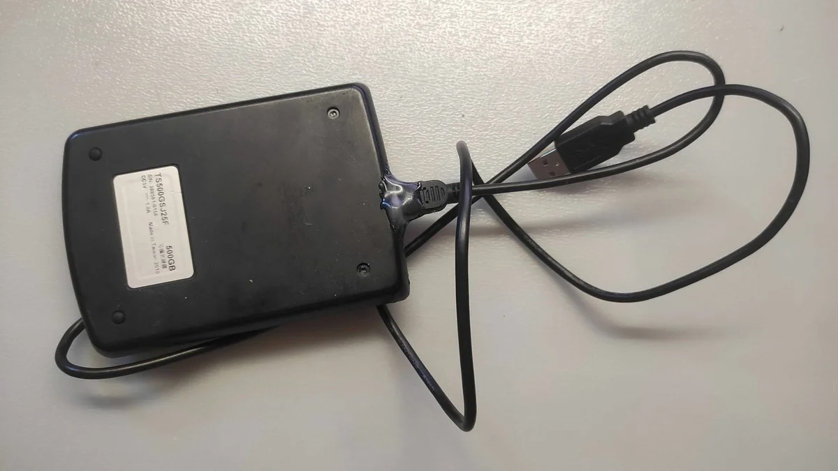 Приклад одного із зовнішніх HDD, старого зразка, де роз’єм так просто не заміниш, він є частина самого диска. Довелося використовувати “кустарні способи”, тепер працює через раз. Фото автора каналу.