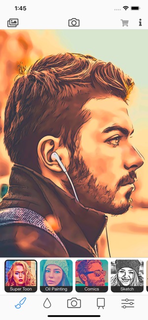 Завантажте зображення з галереї або зробіть знімок за допомогою вбудованої камери. Перегляньте список доступних фільтрів, виберіть відповідний. Стилів безліч – чорно-білі скетчі, картини маслом, комікси та ін.